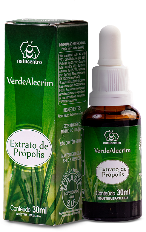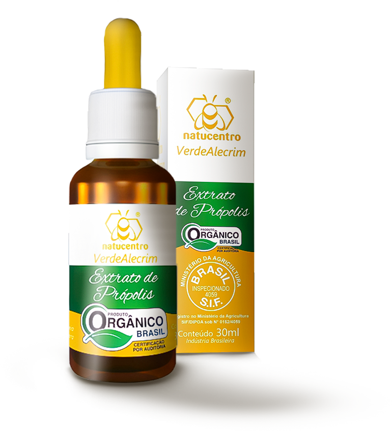 A legítima própolis verde orgânica da Natucentro. A própolis Verde Alecrim Orgânica da Natucentro é produzida segundo as normas específicas e técnicas que a qualifica como sendo um alimento 100% isento de contaminantes químicos e biológicos. Para produzir, envasar e comercializar o Extrato de Própolis Verde Alecrim Orgânico, é realizado um rigoroso processo de certificação de todas as etapas de fabricação, das colmeias no campo até a entrega do produto na mesa do consumidor. Além de inspeções técnicas e periódicas das principais